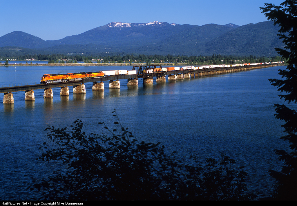 Crossing the bridge over Lake Pend Oreille between Sandpoint and Algoma is a westbound Burlington Northern Santa Fe Z train on June 3, 2002. Two GE C44-9Ws bracketing a former Santa Fe EMD SD75M, all decked out in clean “heritage II” paint, power the hot train.