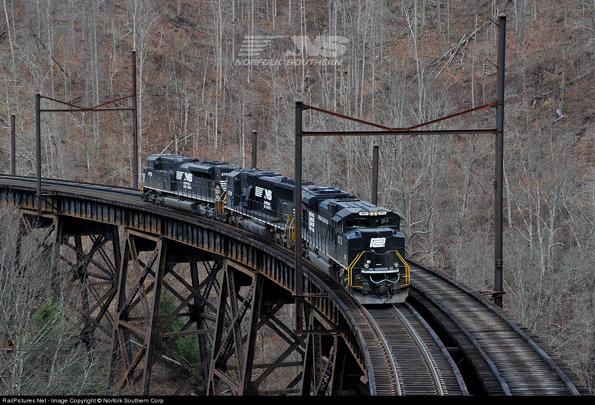 Pocahontas Division train U85 is seen soaring high above Gooney Otter Hollow as it crosses the former Virginian Railway curved trestle at Garwood, WV. The loco set is returning downhill to Elmore Yard (away from the camera) after lugging 100 loads of Tidewater coal up the hill to Clarks Gap, where they will later become part of a Norfolk-bound unit train. The Penn Central heritage unit is far from the real heritage of this line, which featured electric motors that utilized the catenary poles still in place from days gone by. Photo by Casey Thomason. For more information about Norfolk Southern, visit www.nscorp.com