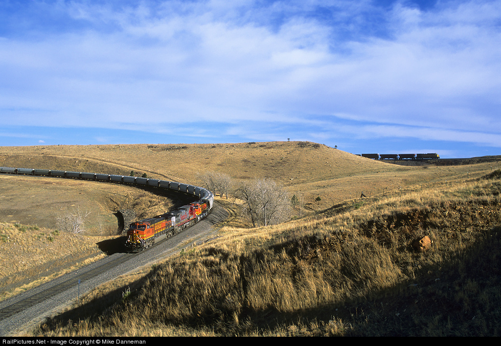 An eastbound Burlington Northern Santa Fe manifest freight approaches the west switch at Rocky, Colorado, on April 13, 2002. Four GE C44-9Ws power the train, with one of them set up as rear DPU, that can be seen on the track above. Between the head end and DPU, the train is circling the mesa that Big 10 Curve uses to gain (or lose) elevation on the grade up the Front Range.