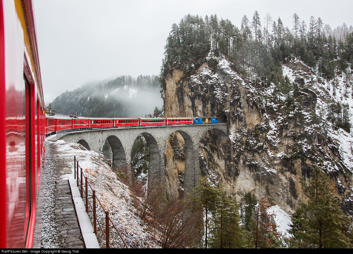 | Locomotive Ge 4/4 III # 652 with publicity paint scheme for Hockey Club Davos (HCD) is pulling RegioExpress 1125 from Chur to St.Moritz over the famous 65 meter high Landwasser viaduct near Filisur. The train had 13 cars, including a diner and two panorama cars behind the photographer. |