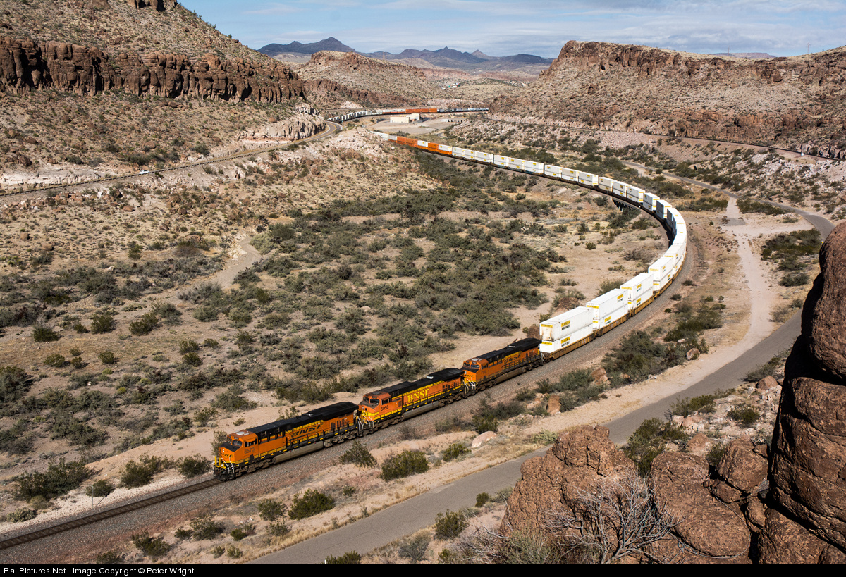 A long westbound stack train curves downgrade through Kingman Canyon, one of the most scenic areas on the BNSF Transcon route through Arizona. The eastbound track, with its easier grade, is on the canyon wall to the right and historic US Route 66 parallels the railroad on the left.