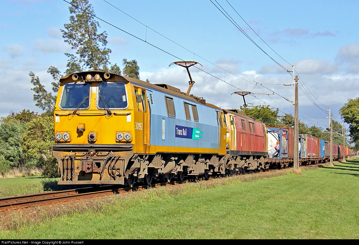 | EF 30192 leads 30007 on train 220 to Westfield north out of Feilding. The section of the North Island Main Trunk from Palmerston North to Hamilton was electrified in mid 1980's with these 4000 Hp locomotives built by Brush Traction in UK from 1986 to 1988. |