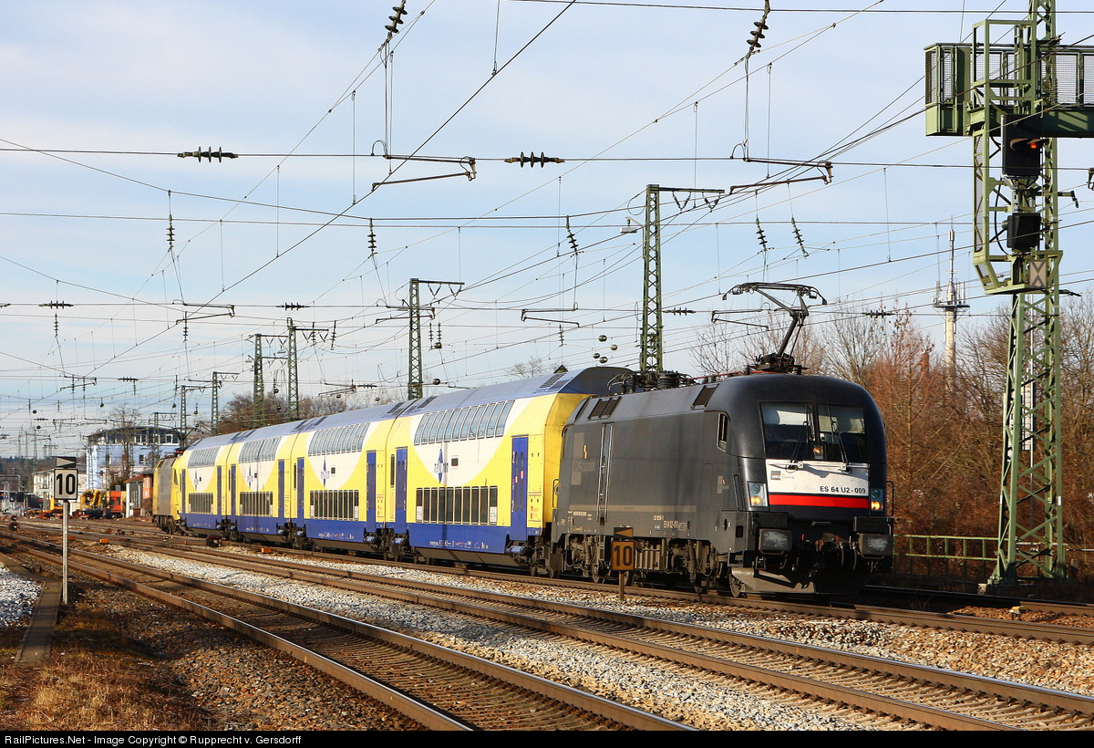 | The 13:35h Meridian Service from Rosenheim to Salzburg should be one of the brandnew FLIRT-EMU's, but due to delayed approval by authorities, this is a rented MRCE-Taurus with 4 bi-Level Metronom coaches and another Taurus of Siemens-Dispolok. |