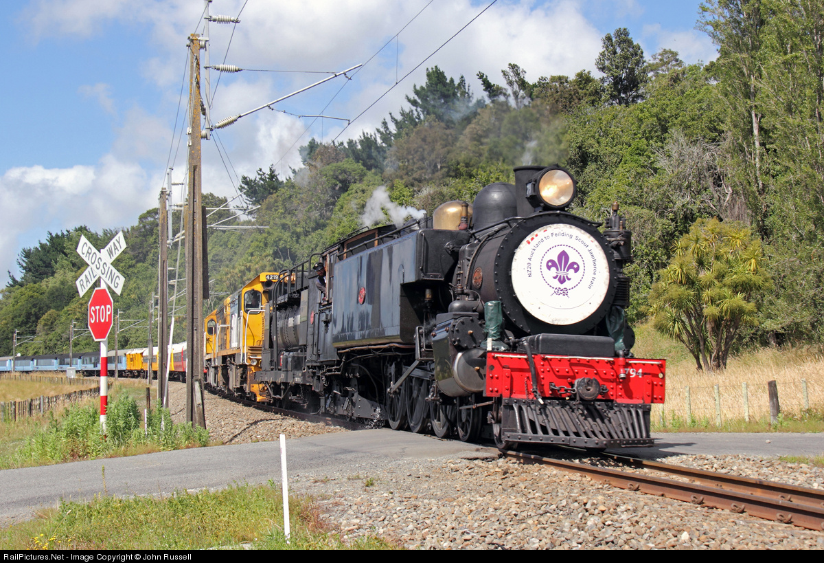 Wab 794 heads a 13 car train from Feilding to Auckland returning Scouts from a national Jamboree. The 4-6-4T locomotive was built by NZR Hillside in 1927. Assisting KiwiRail motive power DC 4219 and DC 4185 (EMD G12 rebuilds) are in different Tranz Rail liveries from 1990s.