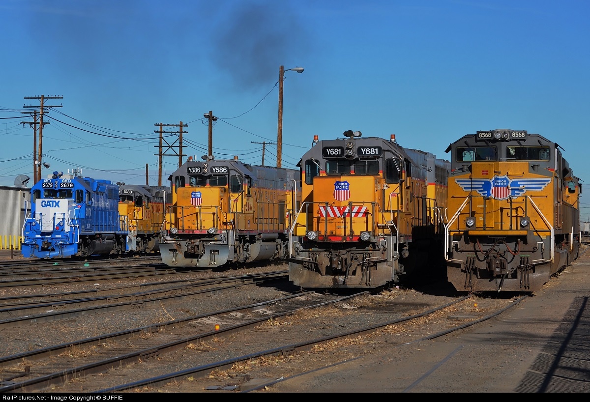 | It's a busy day in the 36th Street Yard as UPY 586 (ex Southern Pacific GP38-2) works sorting freight cars, which UP 8568 (SD70ACe) would eventually take out of town. |