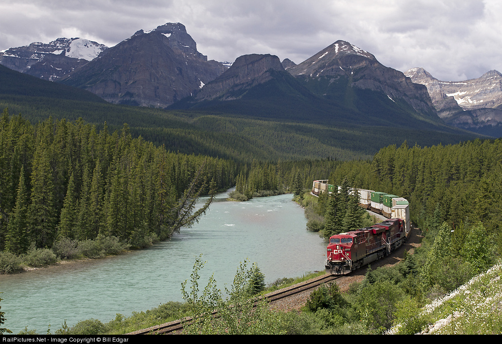An eastbound intermodal/stack train rolls along the Bow River at CP's famous Morant's curve. Made famous by CP photographer Nicholas Morant, this location draws in many photographers from around the world. It is a challenging shot as lighting is best early in the am in early summer. This shot was taken at 1119 am Pacific time, after watching westbounds heading the wrong way in the "best" light for more than two hours.