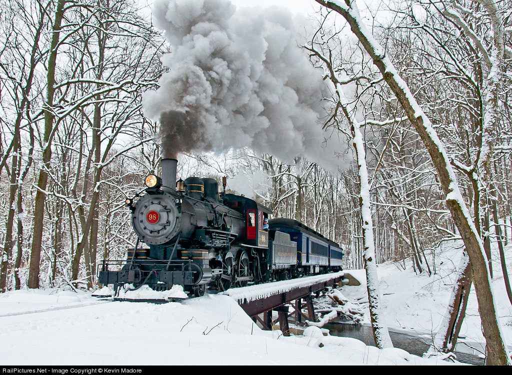 Dashing through the snow. The Wilmington & Western Railroad's 1909-vintage 4-4-0 leads a 2011 Lerro Productions Charter across the snow-covered Bridge 10A and into the line's Mt. Cuba Picnic Grove. This bridge is one of 9 that span the Red Clay Creek on the old B&O Landenberg Branch that is now the Wilmington & Western. In 2003, 7 of the 9 were either severely damaged or destroyed by floods in the wake of Tropical Storm Henri, leaving the railroad with just a couple of miles of usable track. It took a four-year design and construction effort, facilitated by private fund-raising and grants from the Federal Emergency Management Agency (FEMA) to replace the destroyed wooden trestles with modern steel structures like the one you see here, but in 2007, the Wilmington & Western Railroad was able to resume steam excursions over their entire line from Greenbank to Hockessin.