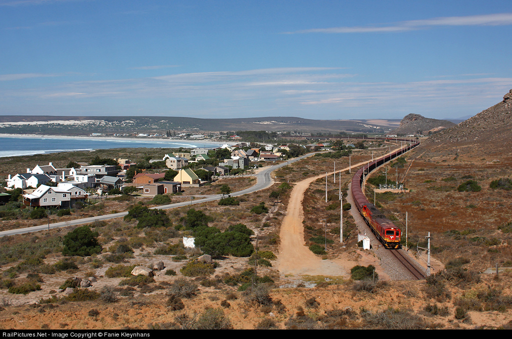 The silence of the small coastal town of Elands Bay is disturbed by a loaded iron ore train consisting of 342 wagons about 3,7km in length passing through, traveling from Sishen in the Northen Cape to the port of Saldanha on the West Coast. Leading the train is a Class 15E electric loco and Class 43 diesel loco (GE C30-ACi). Above the leading locos in the distance is the second helper set and the end of the train can be seen on the left above the ocean disappearing behind the sand dunes.