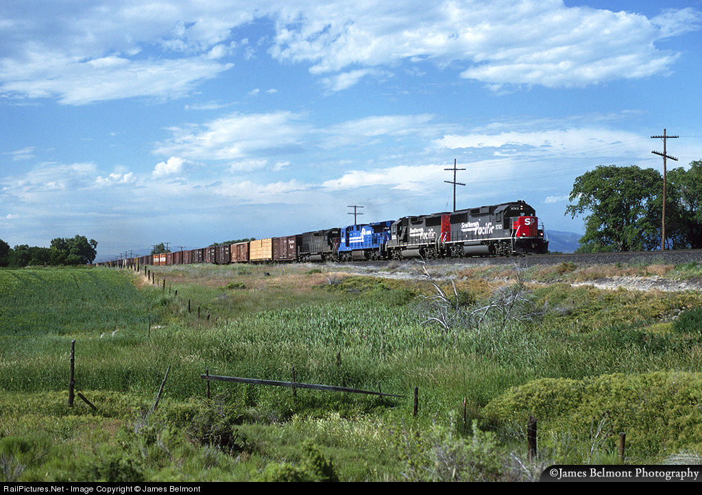 On the Summer Solstice 1993, SP's Eugene to Chicago lumber drag roars east through Riverton with 80 cars for the 'City of Broad Shoulders'. The rural nature of this setting 15 miles south of downtown Salt Lake City is unrecognizable today.