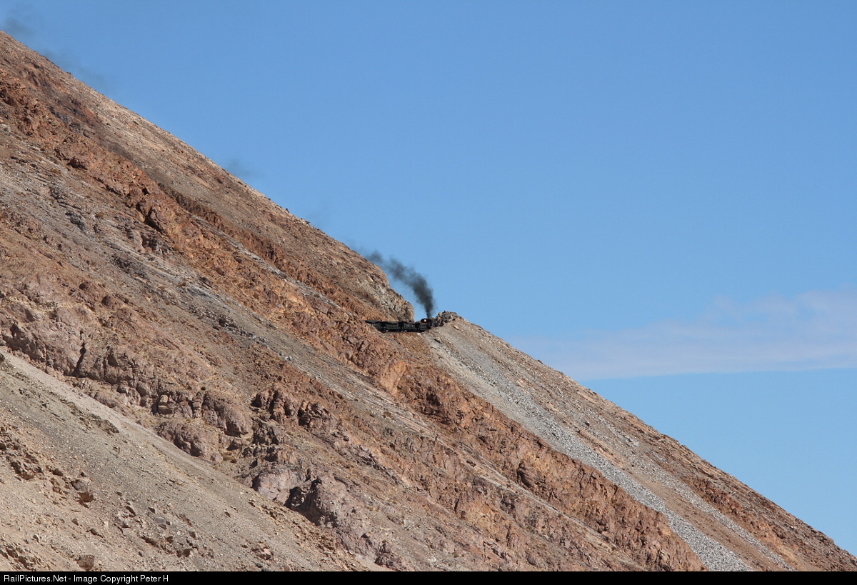 | Incredible to see a railway in these grounds. 3.9% steep the line to Potrerillos is somehow glued into the loose rock slopes of the Río Salado valley. Here GR12U #93 and a sister unit are hard working for hauling a loaded train up to the Potrerillos copper refinery. |