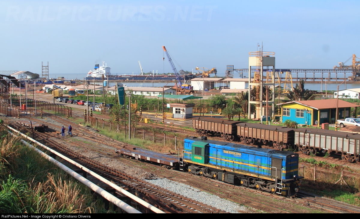 | To increase the capacity of cargo movement at Itaqui Port, the whole place is passing by works as the extension of the back area, building more lines in the rail yards, new terminals and piers. In the picture we can see an Alco RSD-8 maneuvering platform cars in one of the yards located in the port area. |