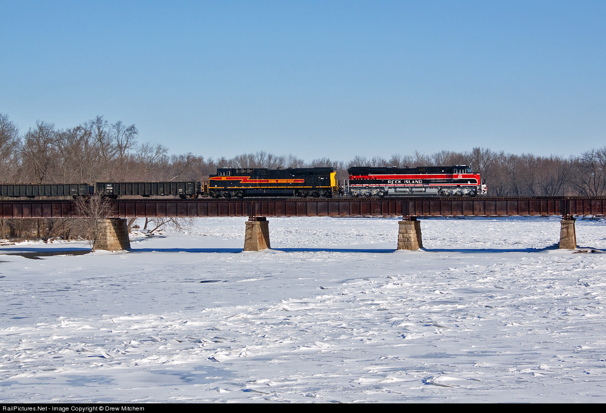 | Iowa Interstate 513 leads a Council Bluffs, IA-Blue Island, IL freight over the frozen Cedar River at Moscow, IA on 1/28/10. |