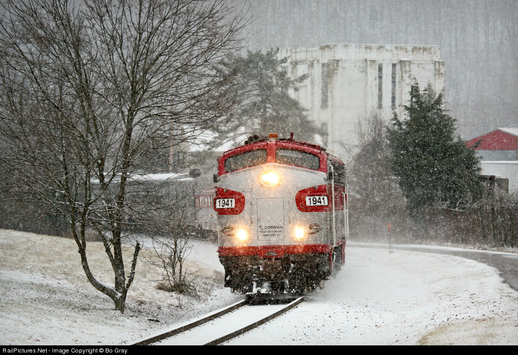 Wind-whipped snow swirls through Benson Valley, near Frankfort, KY; as RJ Corman's F-units power the Old Kentucky Dinner Train on a ferry move from the Bluegrass back to its home in Bardstown.