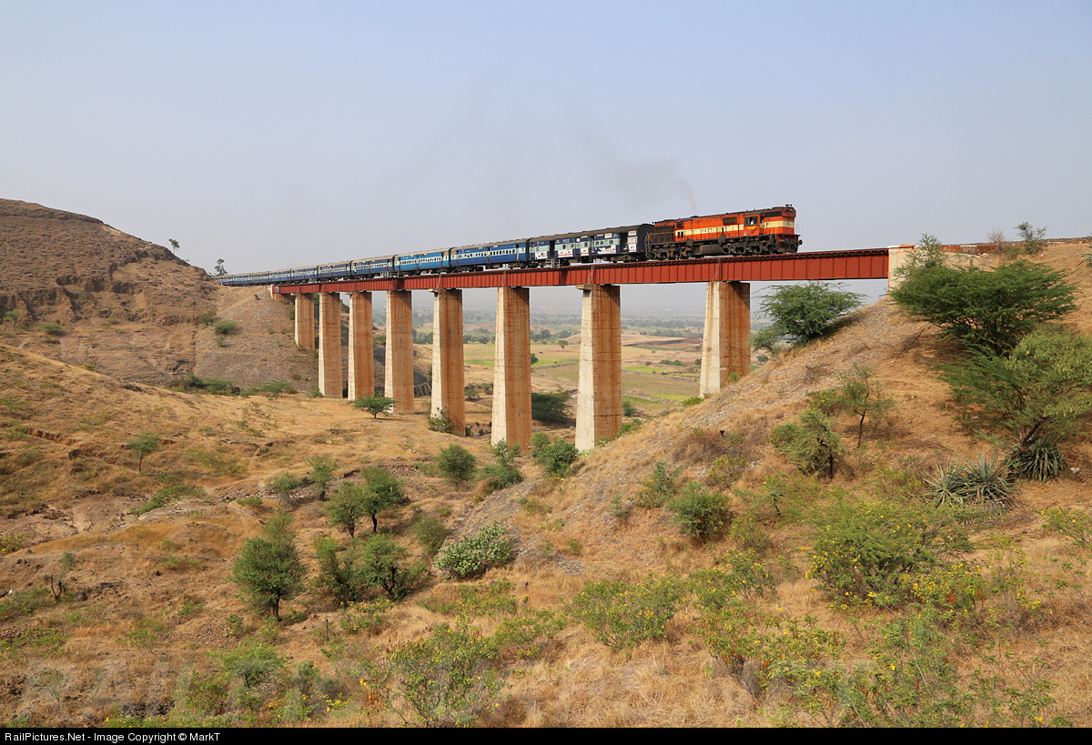 | The mid morning Pune to Miraj passenger train accelerates over Shindavane viaduct, having dropped off track workers at the far end for some maintenance. |