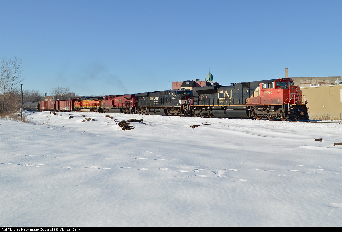 A four Railway lashup! CN 8853, NS 8034, CP 9500 & BNSF 4794 are heading east through the St-Henri neighbourhood of Montreal with a loaded oil train on a clear but cold day. The CN unit had been added to the lashup a few miles west when a new crew took over near Turcot West, prior to that the NS unit had been leading. For more train photos, click here.