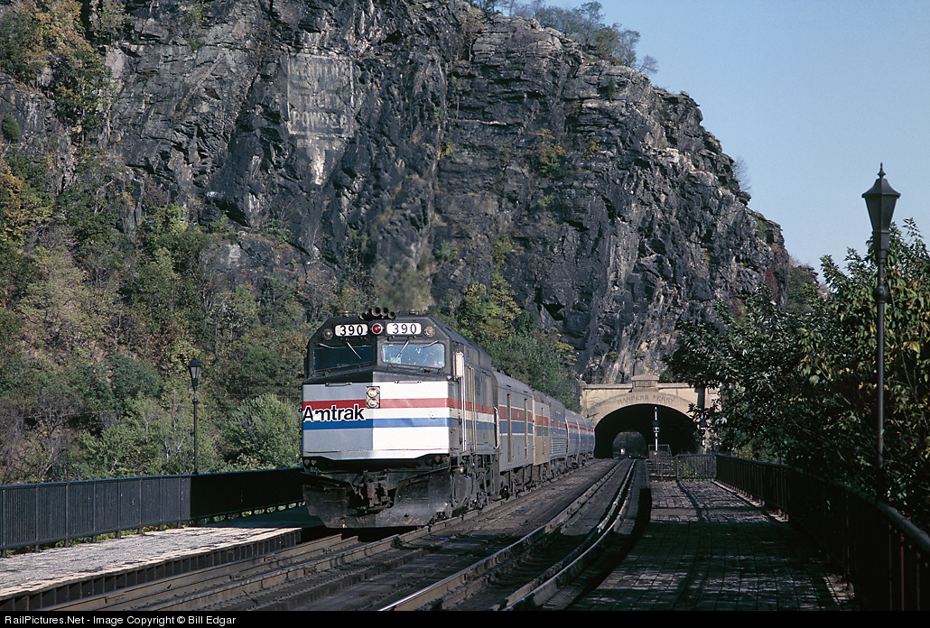 Amtrak train 701 the Blue Ridge arrives at Harpers Ferry station. My slide notes indicated this was the Shenandoah, but research determined that the Shenandoah was dropped the previous year. The other service on this line was the Capitol Limited.