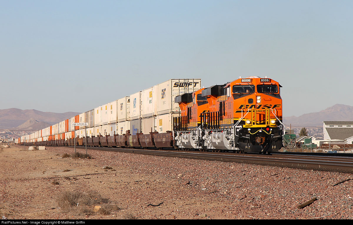 | Working hard upgrade through Hesperia, 2 of BNSF's newest 8000 series ES44C4's lead train QCHISBD towards Cajon Pass. |