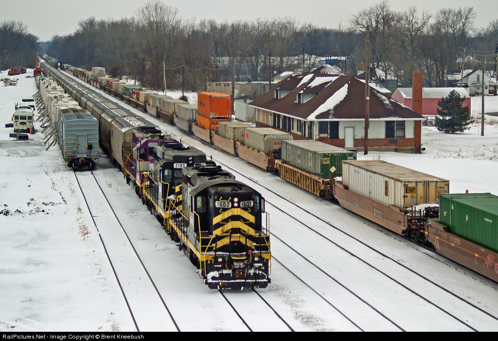 | Indiana Northeastern 1602 brings a grain train into the NS Yard at Montpelier, Ohio from Reading, Michigan. A camp car train is on the left and Canadian Pacific train 243 is on the right. Montpelier was once a Division Headquarters on the Wabash and was the crossroads of the Detroit to Decatur line and the Toledo to Chicago Line. The Indiana Northeastern operates on trackage rights from "Pergo" to the Yard in Montpelier.