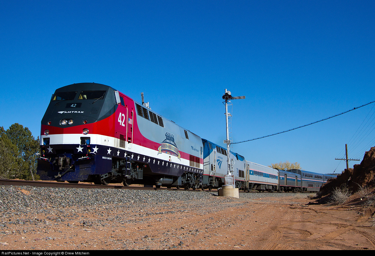 Amtrak 42, a locomotive painted to commemorate Veterans of the US military, leads Amtrak #3 through the semaphores at the intermediate set between Blanchard and Chapelle, NM on 11/12/13.