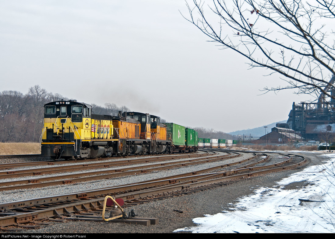 Switchers and Stacks: An LVRB job powered by an SW1500 and two MP15DCs drags a lengthy cut of intermodal cars to the Norfolk Southern interchange adjacent to the Lehigh Line. These cars were loaded in their nearby Bethlehem intermodal facility and are being set out for further handling by NS. Remnants of the former Bethlehem Steel mill can be see at right.