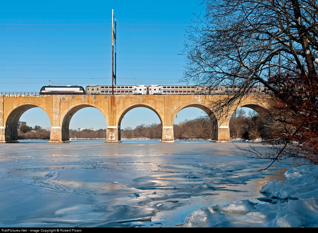 The temperature is hovering around 5ºF as a morning eastbound NJT commuter train crosses the Raritan River viaduct. This train has just departed New Brunswick Station on the Northeast Corridor and in about 45 minutes will terminate at New York Penn Station. The river is coated with a layer of ice the day after yet another snow storm blanketed the region. NJ Transit operated on a weekend/holiday schedule system-wide on this day due to the aftereffects of the storm and severe cold. NJT 4664 is notable as the highest-numbered ALP-46 on the roster and is seen here operating in "push" mode.