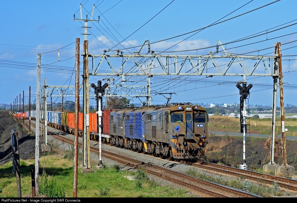 With Durban being the biggest sea port in Africa, container freight volumes on the rails, both in and out of Durban, are high. This is 18-095 / 18-013 / 18-180 with one of the frequent Container Trains, passing through Umlaas Road, as they leave Durban bound for Johannesburg.