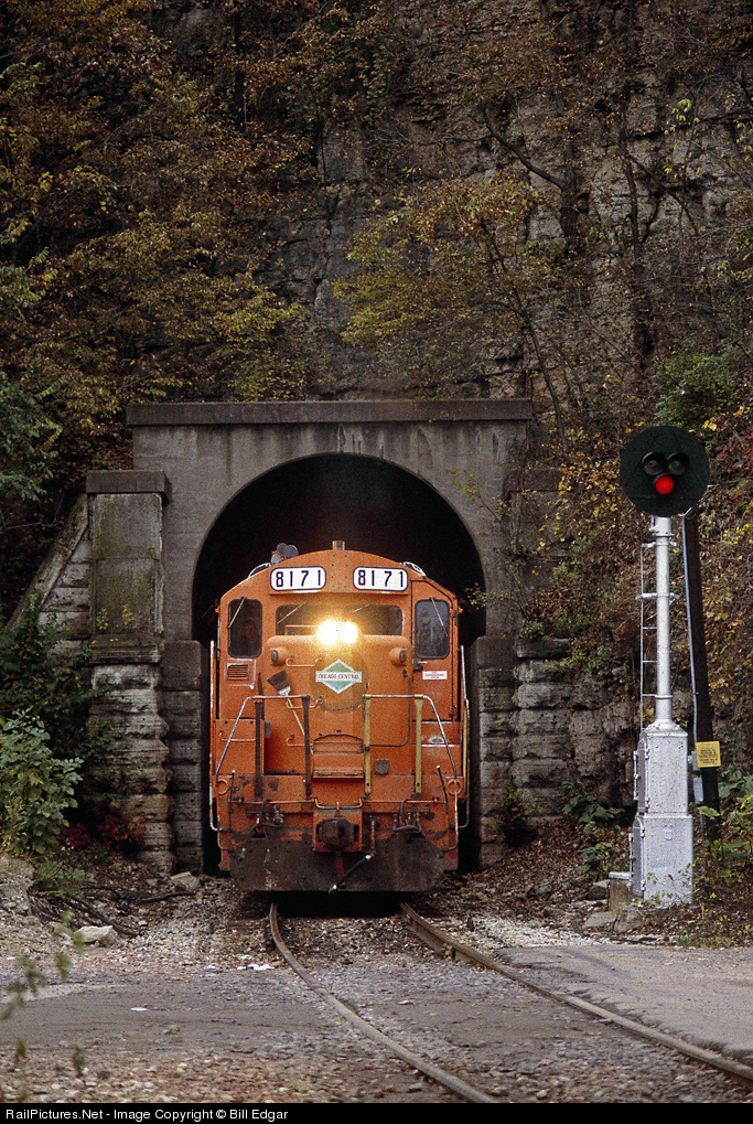 CCP 8171 leads a coal train out of the tunnel at East Dubuque, IL. The tunnel cuts into the bluff, turns 90 degrees, then exits onto a diamond over the former Burlington mainline before crossing the Mississippi into Dubuque. CCP was formed from old Illinois Central lines in northern Illinois and Iowa, and along with IC, became part of CN. This train originated on BN and will tie up at a barge transfer facility a few miles south (east) of this location.