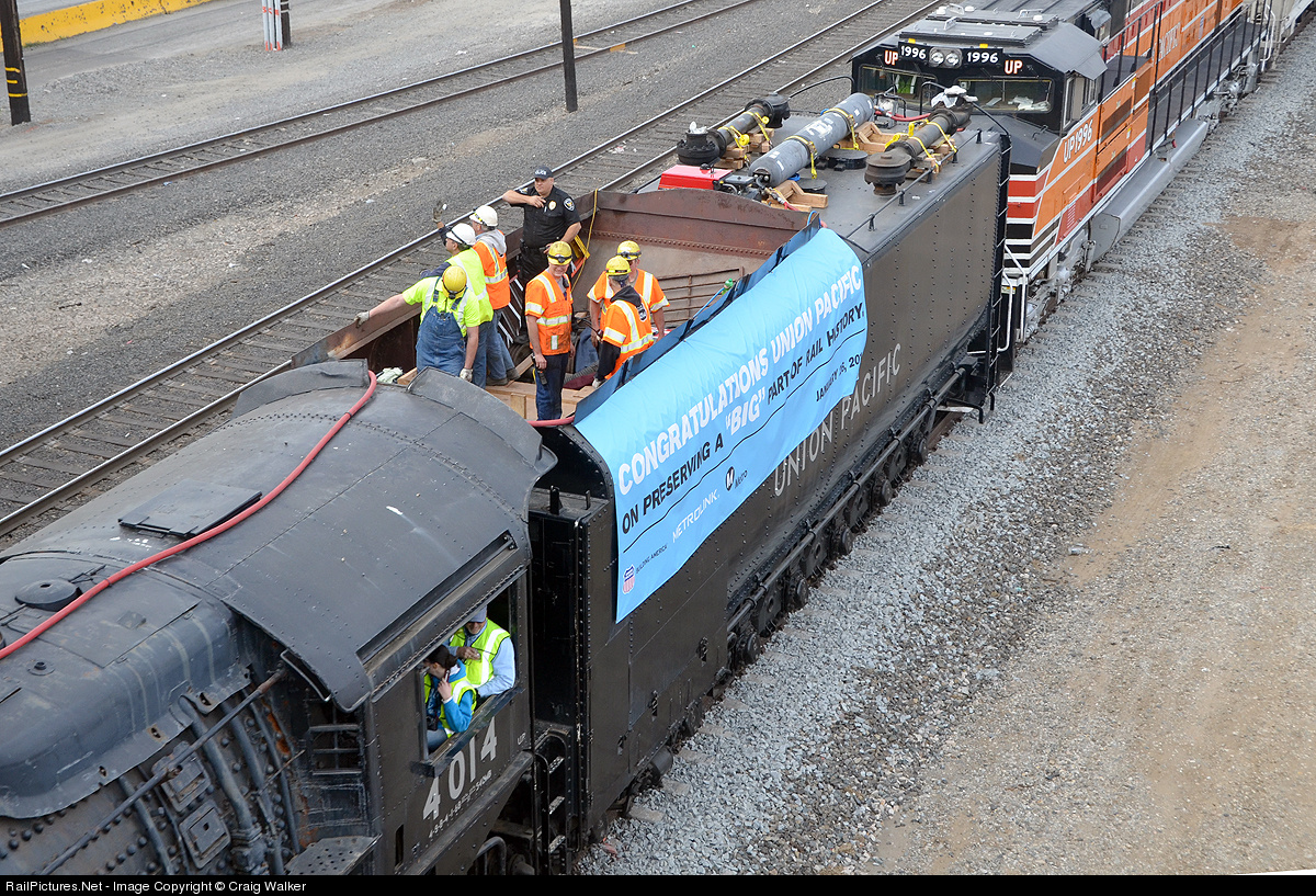 Just when you think you've seen it all... As Union Pacific 4-8-8-4 4014 is ferried to West Colton Yard, a number of the steam crew members and a UP police officer take advantage of the empty coal bunker. When the Big Boy is restored to operating condition, this bunker will be converted to an oil bunker, and the crew will most likely no longer want to ride here.