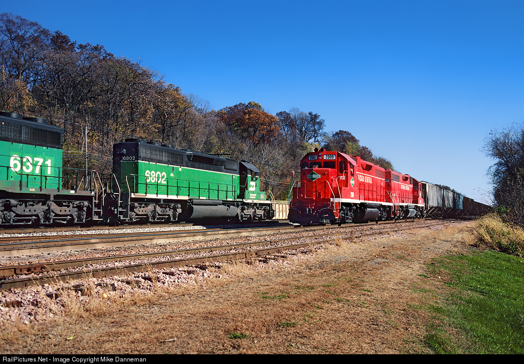 Chicago Central & Pacific train No. 51 meets an eastbound Burlington Northern freight at East Dubuque, Illinois, on October 23, 1993. Powering the westbound CC&P train are EMD GP38 Nos. 2009 and 2007.