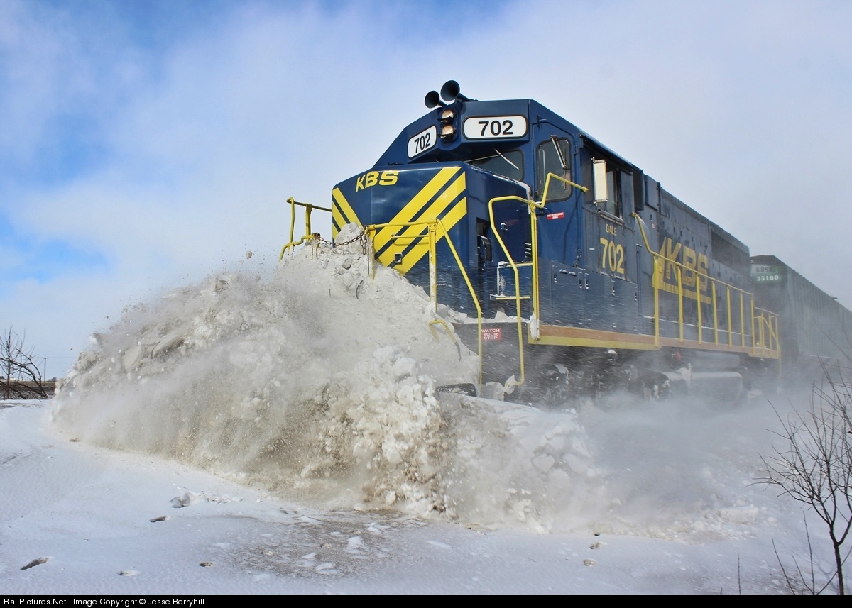 On a terribly frigid Illinois day, a KB&S train is seen busting drifts between Webster and Stockland, IL., on their former Milwaukee Road Southeastern line. These guy's are en-route to Stockland Elevator for a delivery of 30 cars. The locomotive seen here is leading, while another loco is 30 cars back pushing on the rear of the train.