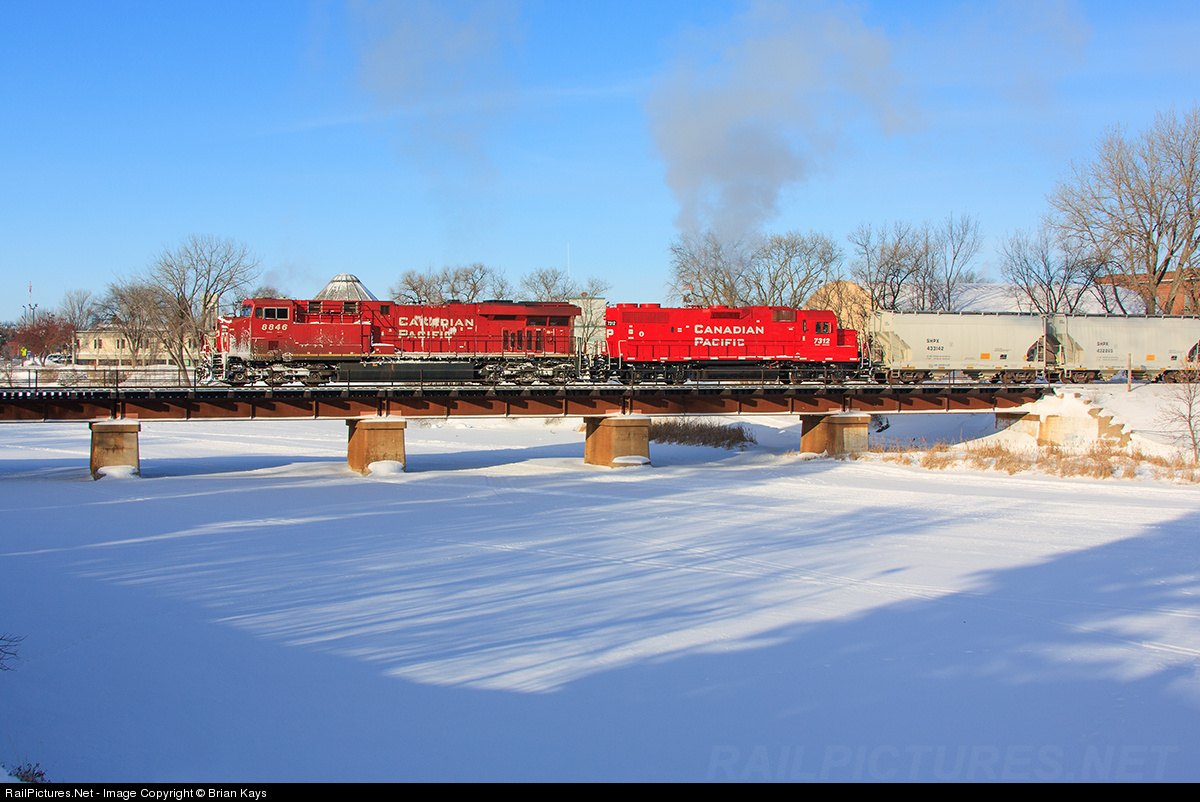 | CP 8846, looking like it has had to bear the majority of the snow at least between Winnipeg to Thief River Falls, and one of the last Delaware & Hudson repainted locomotives 7312, perform some yard switching requiring traveling over the Red Lake River bridge. |