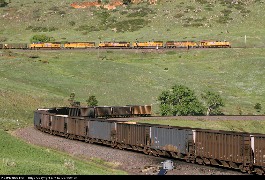 With the rear of the coal train far below, six locomotive on the head end are passing through East Eisele, Colorado, on June 2, 2013. This westbound Union Pacific empty is rolling upgrade at a pretty good clip, with most of the train arcing through Big 10 Curve, which is behind the photographer.