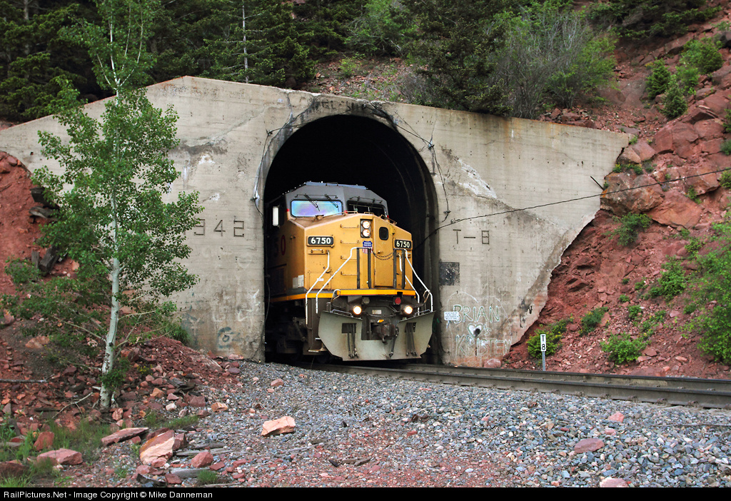 Union Pacific GE AC4400CW No. 6750 pops into daylight out of the west portal of Tunnel 8 between Plainview and Crescent, Colorado, on June 6, 2013.