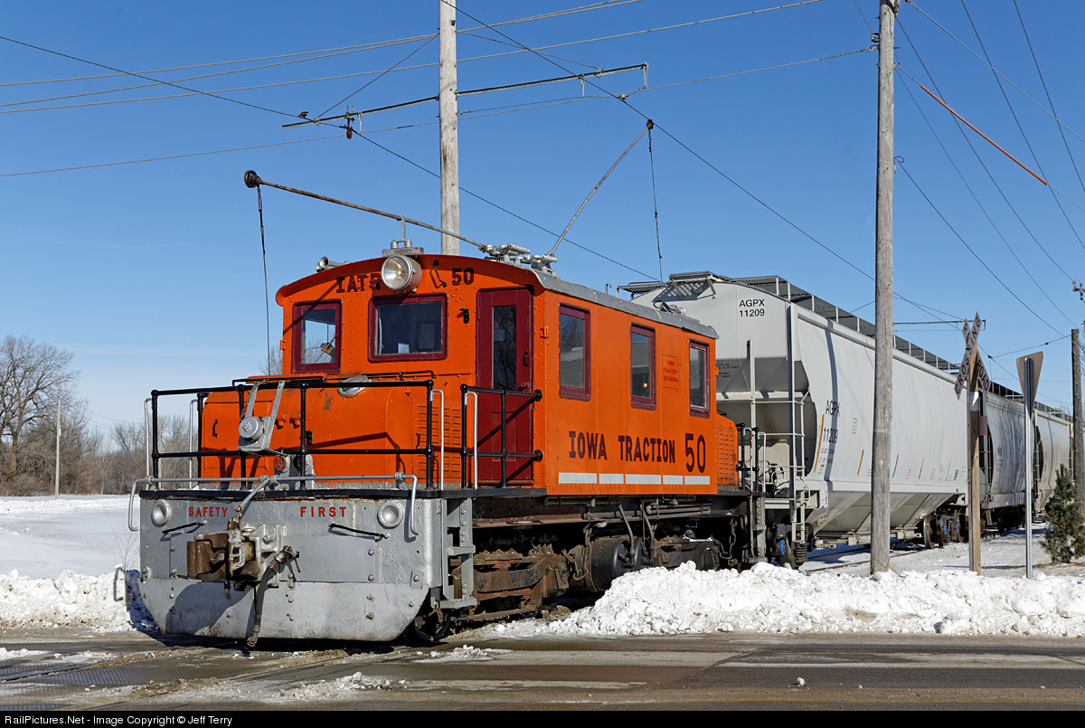 | Iowa Traction 50 pulls a cut of cars across 15th Street in Mason City on America's last all-electric interurban freight railroad. How rare is it? No. 50 is nearing its 100th birthday; it was built by Baldwin-Westinghouse in October 1920 for the Washington & Old Dominion. |