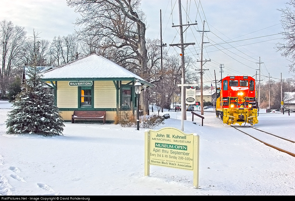 | On a cold Ohio Valley morning, CIND 2002 is in charge of the Indiana & Ohio's Blue Ash Local as it grinds uphill into Silverton on the I&O Blue Ash Subdivision, passing the replica of the original CL&N Silverton Depot that houses the community museum. The Blue Ash Subdivision is one of two segments of the famed Cincinnati, Lebanon & Northern Narrow Gauge Route that the I&O operates. |