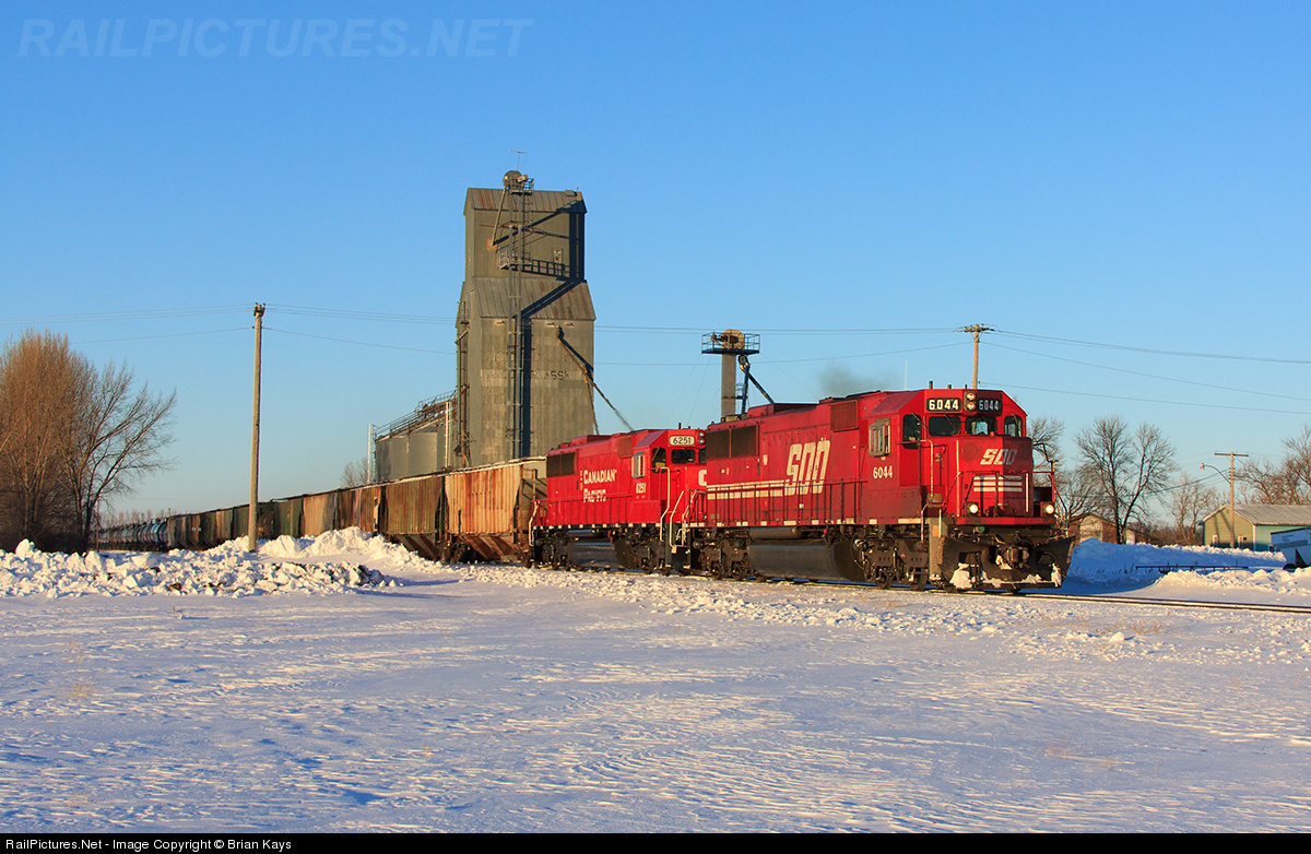 | SOO in SOO Territory SOO 6044 and CP 6251 under the train code CP 486 hustle through down the Detroit Lakes subdivision disturbing the quiet community of Brooks, roughly 22 miles from its origin at Thief River Falls. The horn on 6044 was clean and clear sounding, refreshing from the style mounted on top of Canadian Pacific's GE AC44 and ES44 locomotives. |