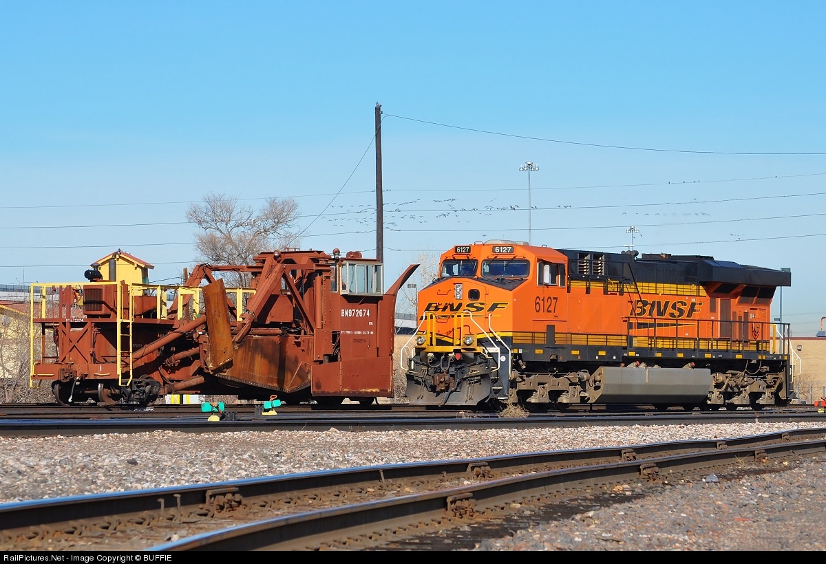 BNSF 6127 (ES44AC) passes the Denver-based Jordan Spreader BN 972674, which you might think is older than it is based on its looks. The spreader, built in 1984, sits on a siding between the Denver Yard and the BNSF engine servicing yard.
