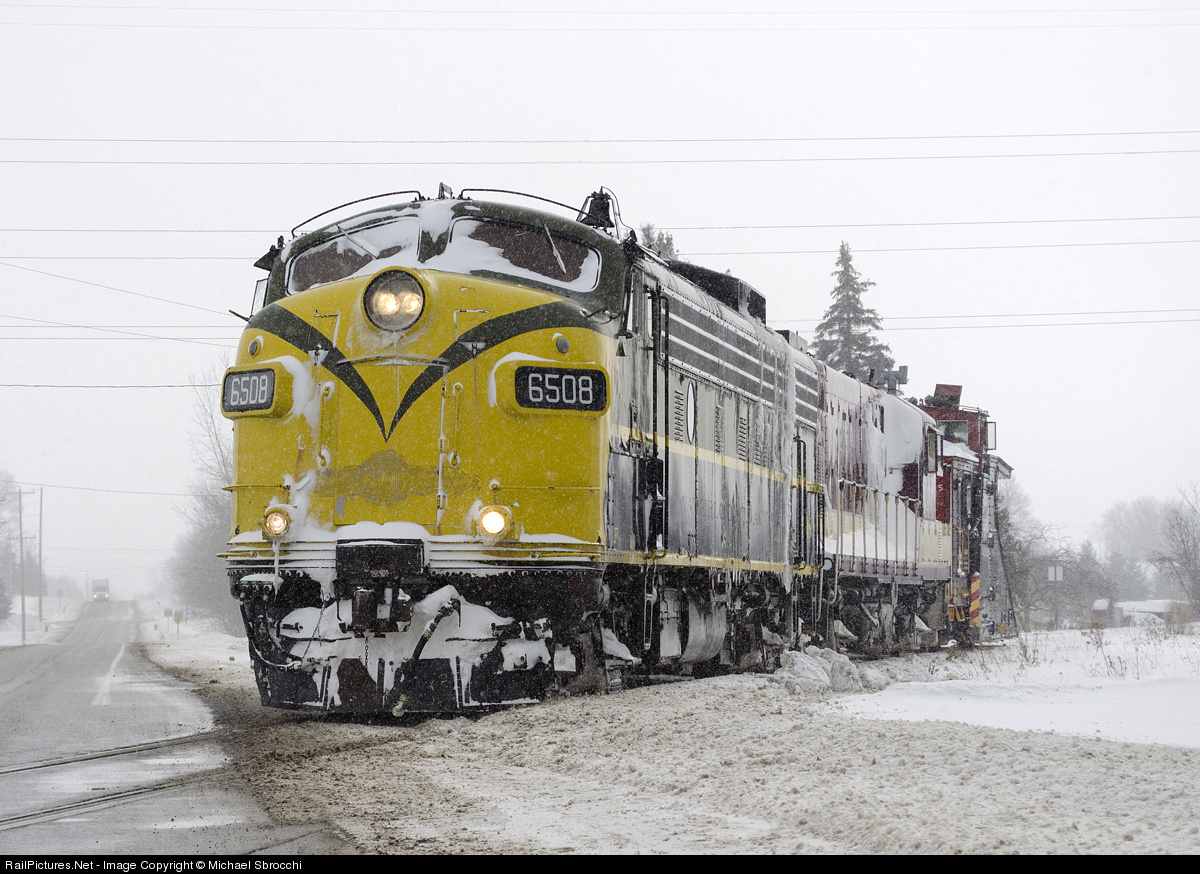 | A former CN/VIA GMD FP9 built in London, Ontario and formerly serving the Waterloo and St. Jacob's Railway (WCXX), is now seen here working on the OSR bringing the snow plow back after doing an extraordinary plow run from Salford. |