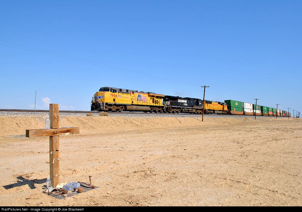 westbound UP intermodal train passing cross placed in memorium to the death of a couple of railroaders involved in an unfortunate rear end collision at this spot back in Nov 2007. In Jan of '08 the engineers widow, my wife and I placed the cross as I knew the family well.