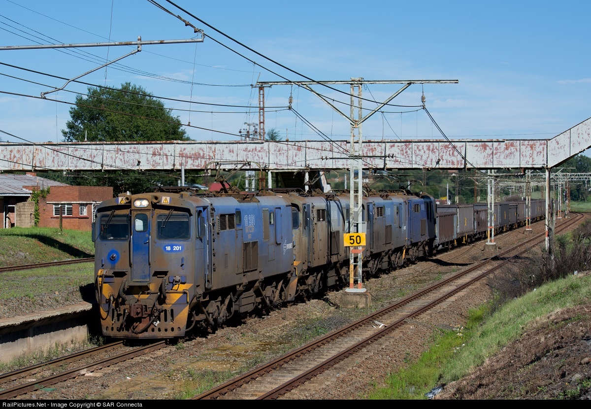 A Durban bound Coal Train, with 18-201 at the front, passes under the old footbridge at Cedara Station in the KwaZulu Natal Midlands. This train has slowed down to the 30km an hour speed restriction for this section and will shortly enter the second longest tunnel/s, the Cedara Tunnels, in South Africa at the start of the steep drop down into Pietermaritzburg. The twin Cedara Tunnels were built in 1960 and are 6km's long. They were the longest tunnels in South Africa until 1989, when Tunnel 4 on the Hex River pass was opened.