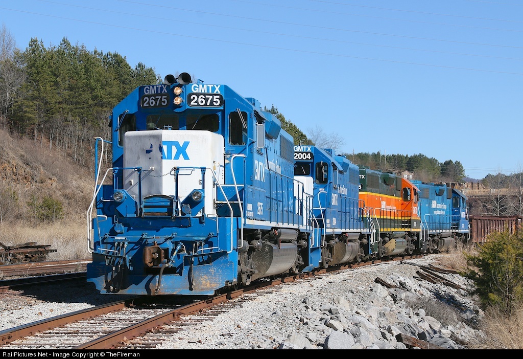 | An Iron Ore train prepares to leave Copperhill Yard. We now have 4 GMTX leasers to haul the ore train down the mountain. GMTX 2675 was transferred from TVRM's Tyner Terminal Rwy to the Hiwassee District just a few days before. |