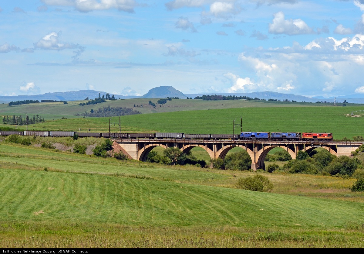 Early on a beautiful morning in the KwaZulu Natal Midlands, 18-416 crosses over the Mooi River, with a load of empty C Type Wagons (ore), into the predominantly dairy producing town of the same name, Mooi River. The lush grazing pastures are vibrantly green at this time of the year (late summer), due to the generous summer rainfall in the area.