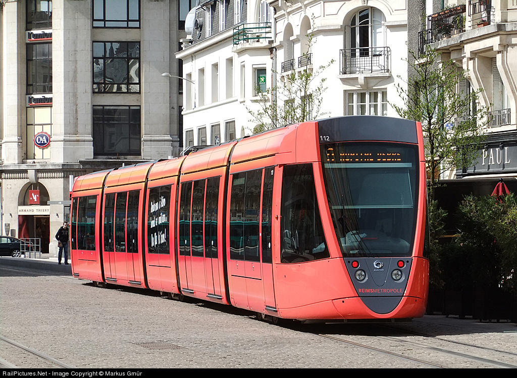 | A really new tramway on a test run: a few days after this photo was the opening from these tramlines at Reims (standard gauge, 2 lines, 23 stations, length 11.2 km). These tramways (Alstom Citadis 302) run with electric power or a conductor line. The color is one of eight choosed |