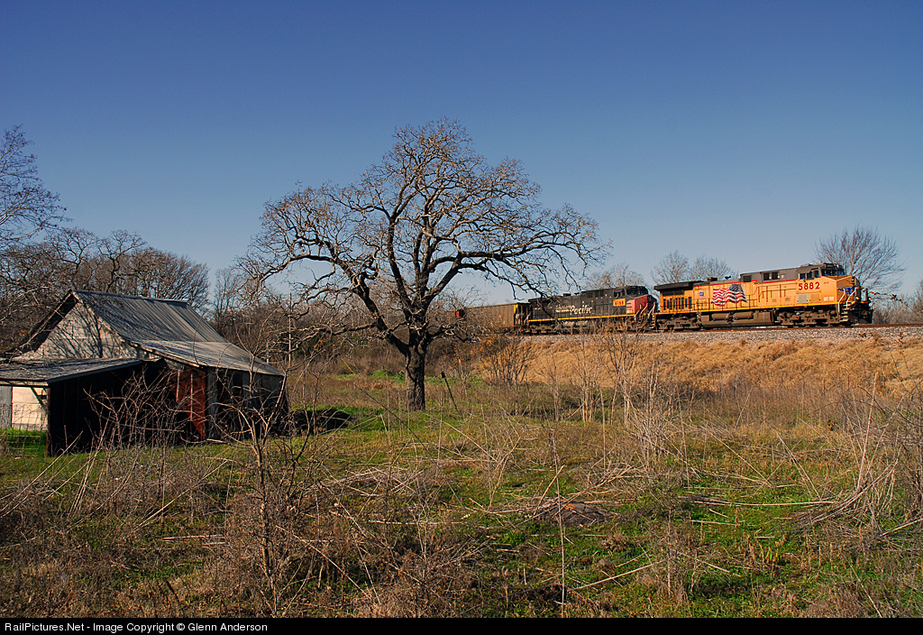 UP 5882 and patched SP 6188 lead SATX coal empties north on the Austin sub past an abandoned barn near Rockdale, Texas. This is the former Missouri Pacific St. Louis to Laredo main line, originally the International & Great Northern. This view is possible only in winter due to the heavy overgrowth of the foliage most of the rest of the year, which blocks not only the train, but even the barn.