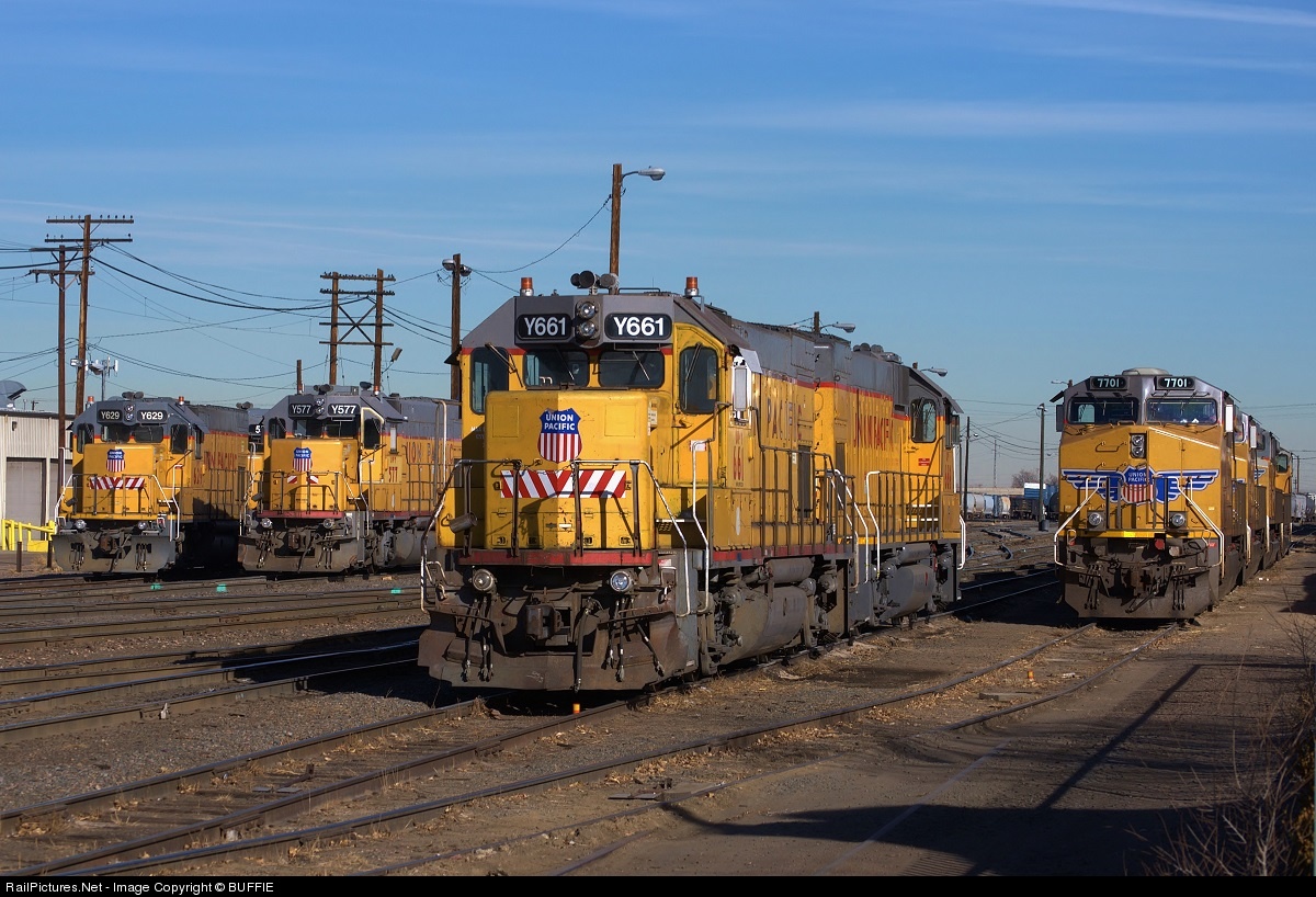 UP 7701 waits for the light power to assemble a mixed freight in the 36th Street Yard.