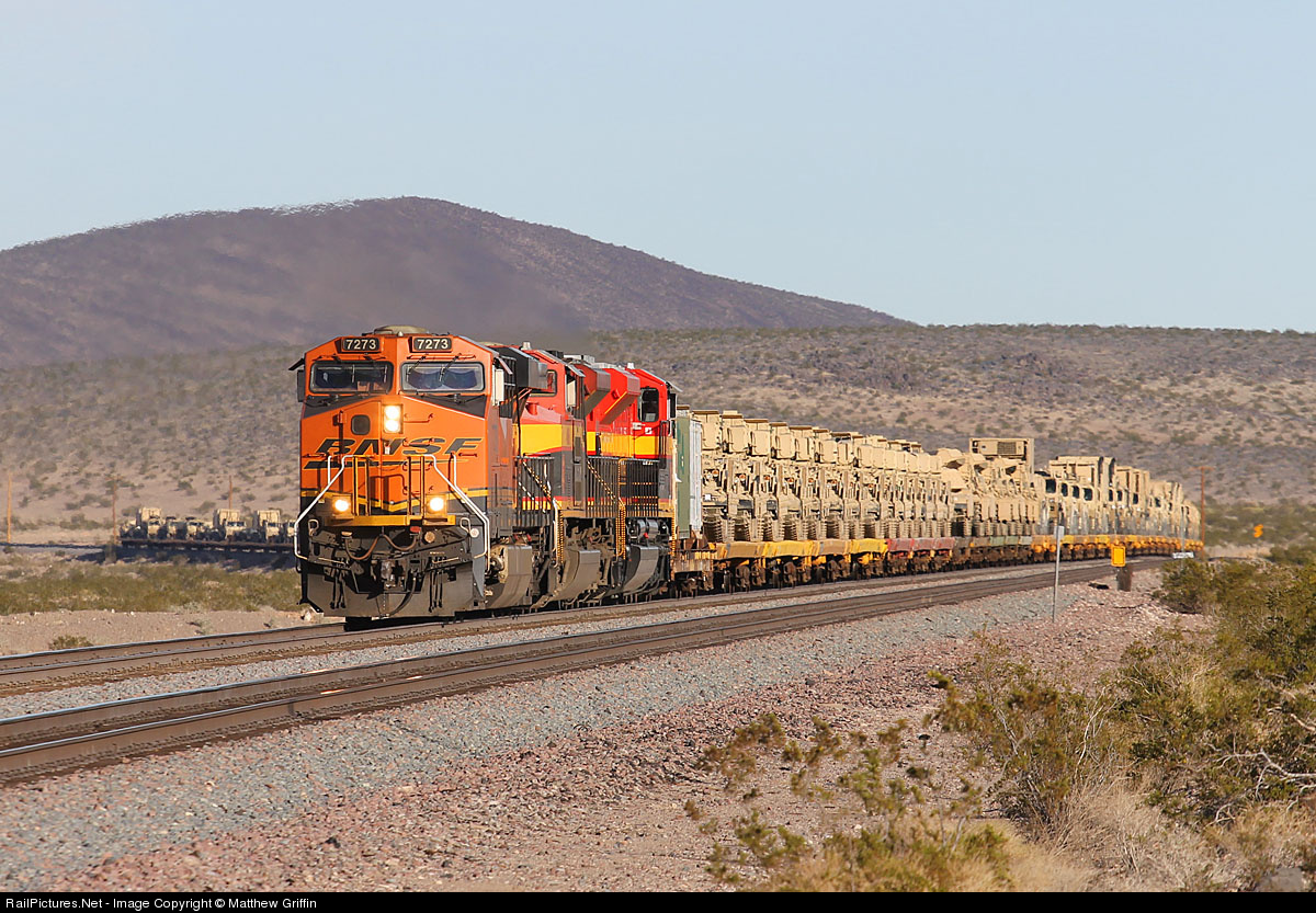 BNSF 7273 leads this westbound military train near the Route 66 crossing just east of Ludlow.