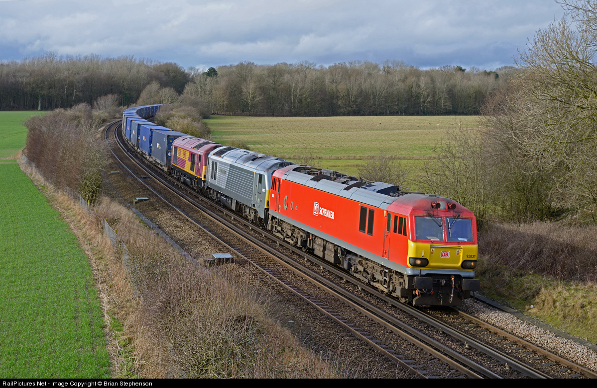 | We don't often see multi loco lash-ups in the UK and even fewer with different liveries but to-day train 6B45 Unit 45 container train for the continent via the Channel Tunnel was hauled by dual voltage electric Co-Co (third rail and overhead power collection) red DB Schenker No 92 031 with dead in train class 67 diesel locos Nos 67 012 in Chiltern Railways livery and 67 019 in rather tired old EWS colours. The two diesels will be dropped off at Dollands Moor where they will undergo light maintenance. |