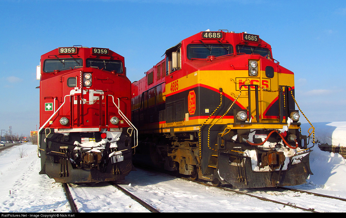 CP 9359 (298) and KCS 4685 (486) await recrews on a bitter cold afternoon in Bensenville.
