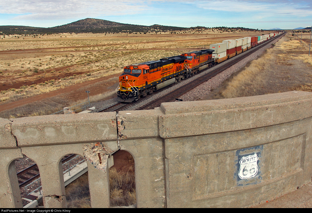 The passage of time has treated what were once the two primary methods of traversing the southern United States very differently. The railroad, affectionately known as the Transcon, has never been better, with its pristine double track right of way hosting an average of 60-80 trains every day between Los Angeles and Chicago. Route 66, on the other hand, saw its heyday pass more than forty years ago with the construction of nearby Interstate 40. Here, a westbound intermodal train marches past one of the many crumbling Route 66 relics in this part of the desert southwest.