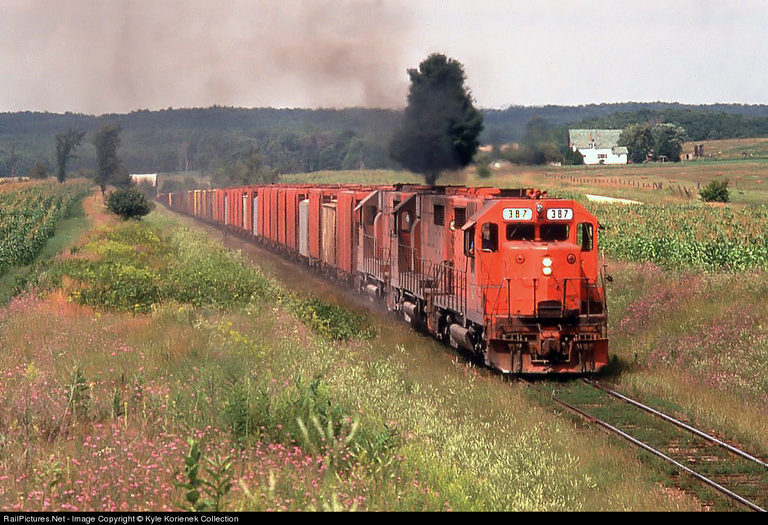 The steepest grade on the former Ann Arbor, Boon Hill, was always a struggle for southbound trains. At about 2%, the three GP35's fight hard to bring their train up the hill, however, once clear of the hill, it was an easy ride into Selma Yard in Cadillac, where trains would work before heading south to Owosso and eventually Toledo, OH. This portion of the former Ann Arbor is still in operation by current owner Great Lakes Central, but the line only extends to Yuma, MI., about 10 miles from this point, as the line was cut off from Yuma north after the end of ferry service and the closing of the yard in Elberta. The only purpose of the line now is to reach a sand pit that is in Yuma. 35mm slide from my collection, photographer unknown.